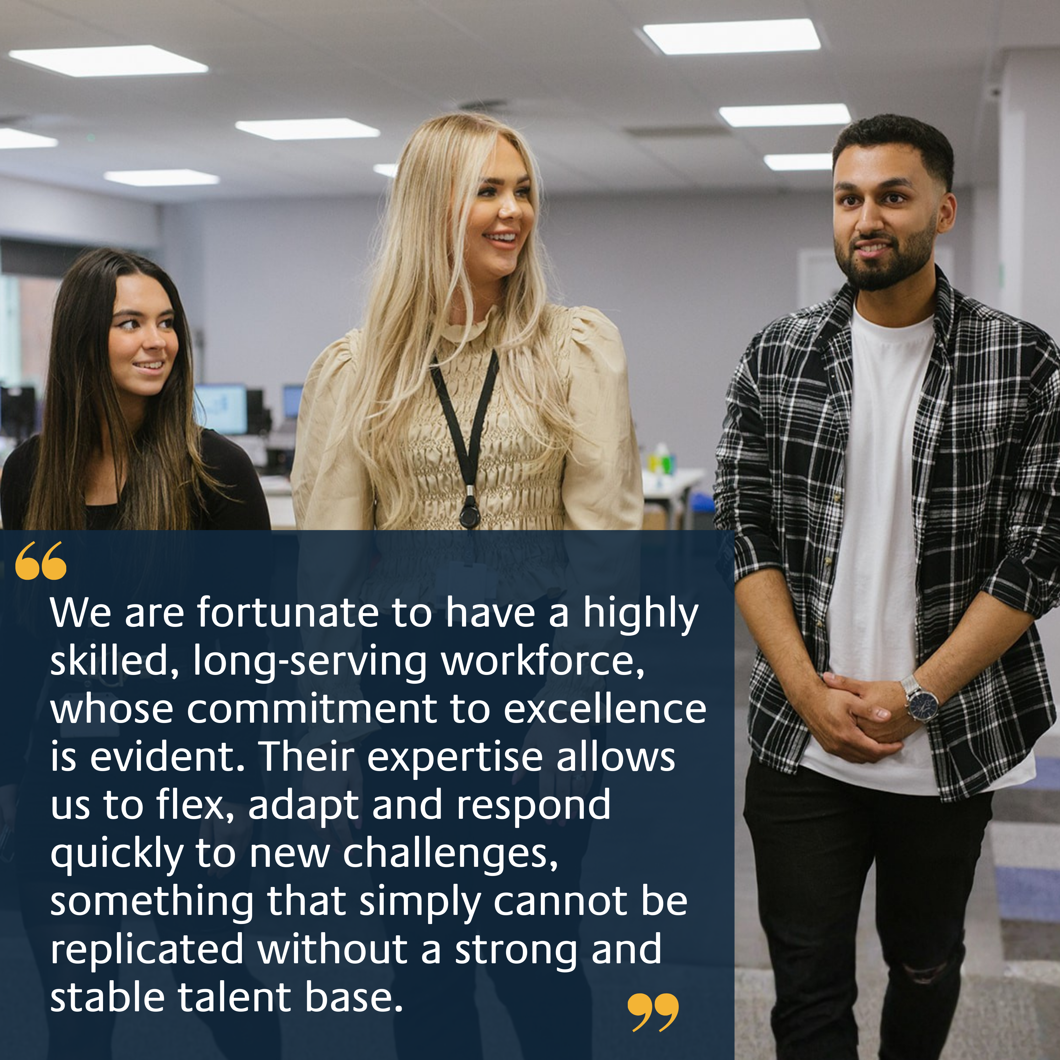 We are fortunate to have a highly skilled, long‑serving workforce whose commitment to excellence is evident. Their expertise allows us to flex, adapt and respond quickly to new challenges, something that simply cannot be replicated without a strong and stable talent base.