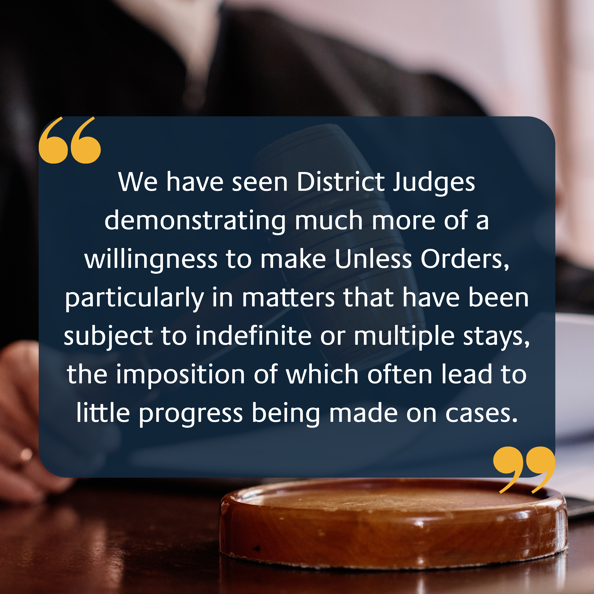 Since the welcome clarification provided by the Judgment, we have seen District Judges demonstrating much more of a willingness to make Unless Orders, particularly in matters that have been subject to indefinite or multiple stays, the imposition of which often lead to little progress being made on cases.