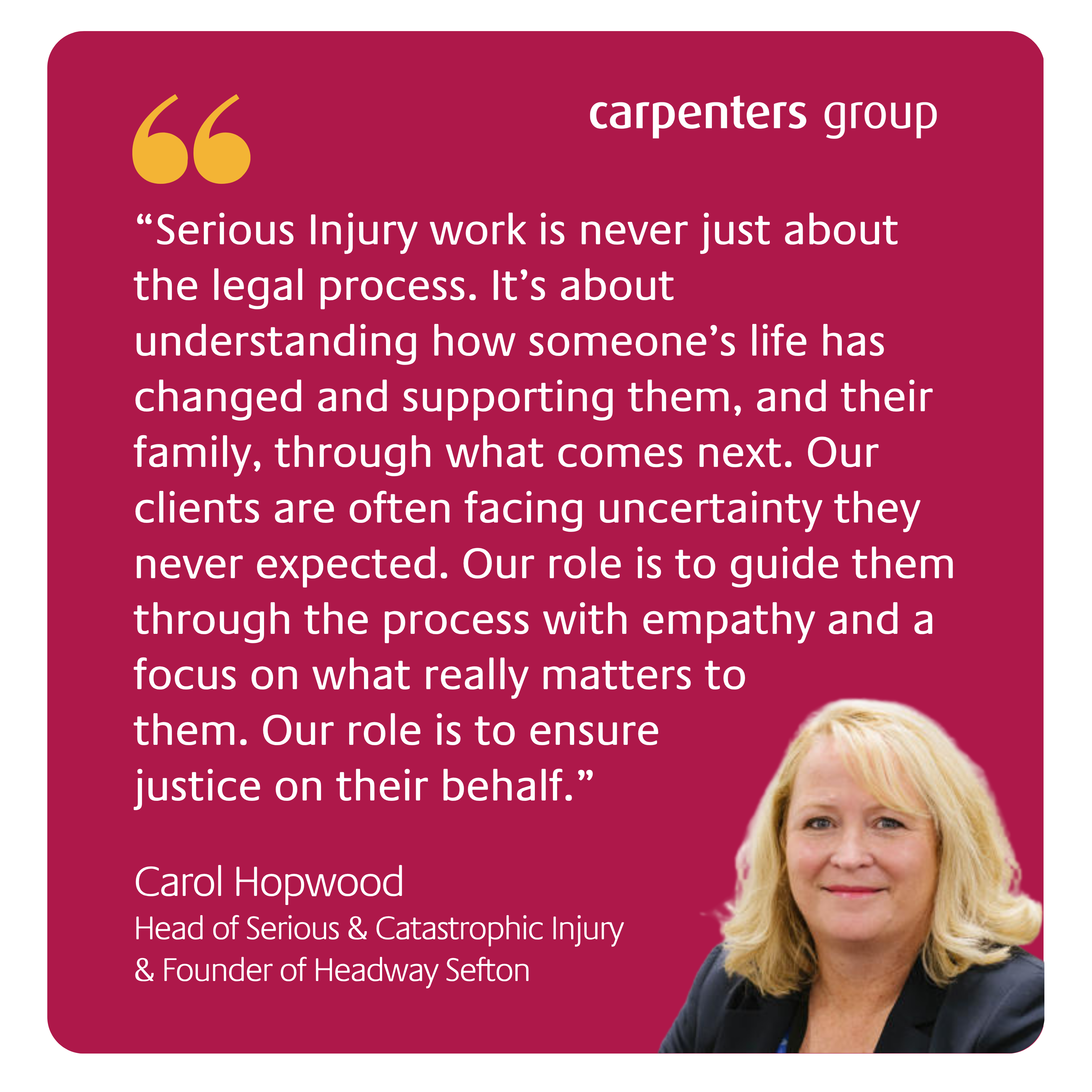 At Carpenters Group, our Serious Injury team exists to support people through some of the most difficult periods they will ever face. The work they do is complex and technical, but at its heart is something far more human. Listening. Understanding. Supporting people as they rebuild their lives.